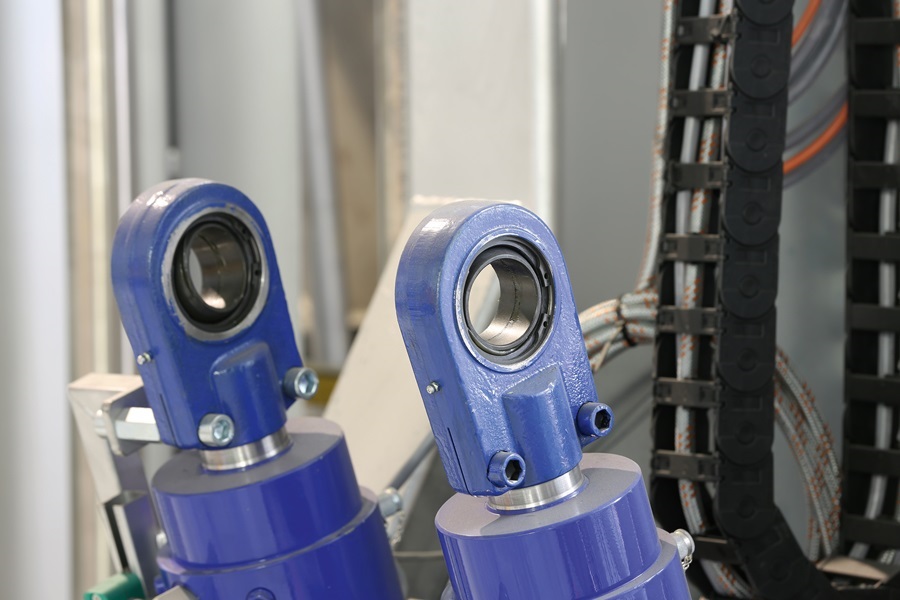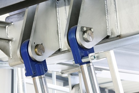 Bei dem großen Brenner sind Gelenklagerköpfe an den Hydraulikzylindern installiert, aber zusätzlich auch fest verbaut. Zum einen muss der Arm sicher geführt werden, wofür zwei Lager im Einsatz sind, die leichte Fluchtungsfehler ausgleichen. Gleichzeitig müssen sie aber auch eigentlich die ganze Last aufnehmen. Zum anderen gibt es Gelenkköpfe an den Hydraulikzylindern, um beispielsweise keine Querkräfte auf die Kolbenstangen oder die Dichtungen wirken zu lassen. Dadurch würde die Konstruktion einerseits schwergängiger und auf Dauer würde es zu einem erhöhten Verschleiß am Zylinder und an den Lagerungen kommen.