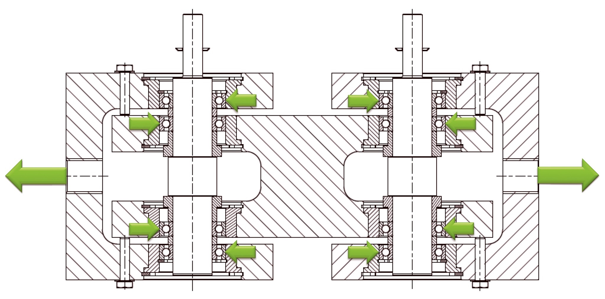 Durch das Aufbringen einer Zugbelastung zwischen den zwei U-Profilen erfolgt eine gleichmäßige Kraftübertragung durch alle acht Lager.